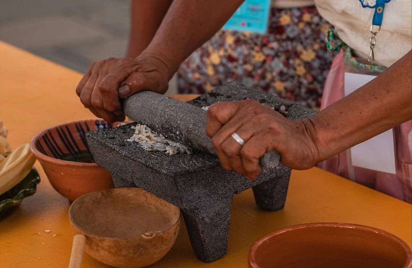 Using a molcajete to pound grains, spices and veggies