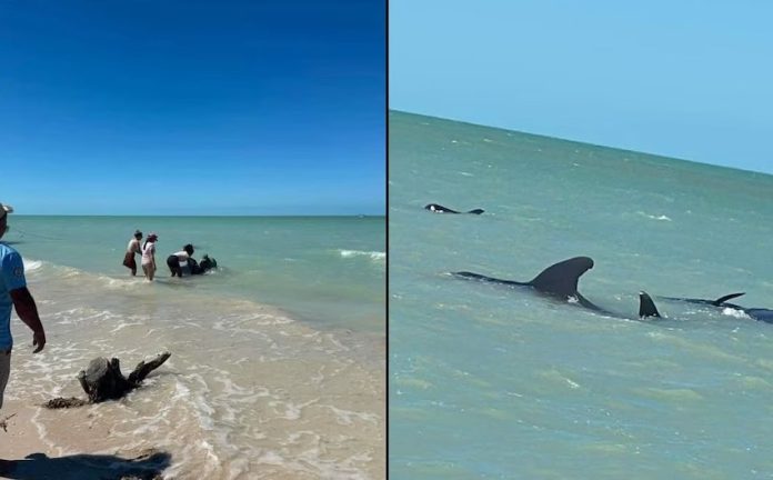 Local residents and national park personnel on Tuesday rescued 21 short-finned pilot whales that had become stranded near a beach in the Celestún Biosphere Reserve, in western Yucatán state.